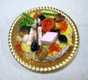 【使用具材など】海老、スモークサーモン、うなぎ、いくら、アスパラガス、菜の花、ひし餅かまぼこ、錦糸玉子、椎茸煮、人参煮、筍煮、わらび煮、あおさ海苔、ゆり根花びら、干瓢煮